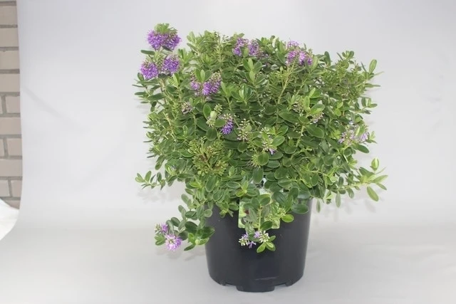 Hebe franciscana heeft kleine groene bladeren. De plant wordt maximaal 80cm en is breed groeiend. Bloeiend met trossen paarse bloemen.