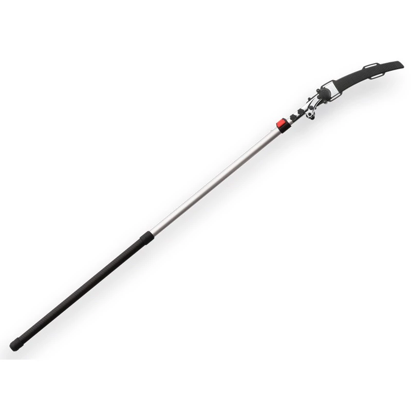 Silky stokzaag ZŸbat 3300-7.5 2 delig uitschuifbaar tot 3m30 + zaagblad en hoes. (SILKY artikelnummer KSI327215) Transsport/ingeschoven lengte: 2000 mm (incl. blad) Het 330mm lange gebogen blad van de ZŸbat stokzaag is voorzien van SilkyÕs unieke Mirai-Me vertanding. Deze laser uitgesneden tanden, met een kerf van 1.4 mm. zaagt snel en eenvoudig. Het zaagblad is verchroomd, flexibel en alleen de vlijmscherpe tanden zijn impuls gehard. Door de ovale vorm van de aluminium stok staat het zaagblad in de juiste zaagrichting en geeft precieze controle tijdens het snoeien op hoogte. Tevens zorgt de ovale vorm van de steel voor kracht en stijfheid over de gehele lengte en wordt buigen tot een minimum beperkt.. De vergrendelmechanismes (drukknoppen en klemmen) geven samen de meest veilige en stabiele vergrendeling van de gewenste stoklengte. De klemmen van de steel en vastzetknop van het zaagblad met dul worden allebei in het verlengde van elkaar aan de bovenzijde van de telescoopsteel bevestigd. Het onderste stokdeel is omwikkeld met rubber voor een comfortabele en veilige grip. De stootbumper aan het uiteinde beschermt bij stoten of vallen. Het zaagblad maakt u het beste schoon met olijfolie. Hars lost op in olijfolie en dit is dan ook een effectieve en milieuvriendelijke manier om het blad te reinigen en de zaagcapaciteit te behouden. Tip: wanneer u de zaag niet gebruikt, maak deze dan goed droog voordat u stokdelen in elkaar schuift. Schuif de meegeleverde hoes over het gereinigde zaagblad en bewaar de stokzaag op een droge plaats. Kortom: Een echte professionele Silky stokzaag die qua prijsniveau ook erg geschikt is voor particuliere kwaliteit liefhebber. De naam ZŸbat komt voort uit het geluid dat een Samurai zwaard maakt wanneer deze zijn doel raakt. Geproduceerd in Japan sinds 1919 uit hoogwaardig SK-4 Carbonmetaal.
